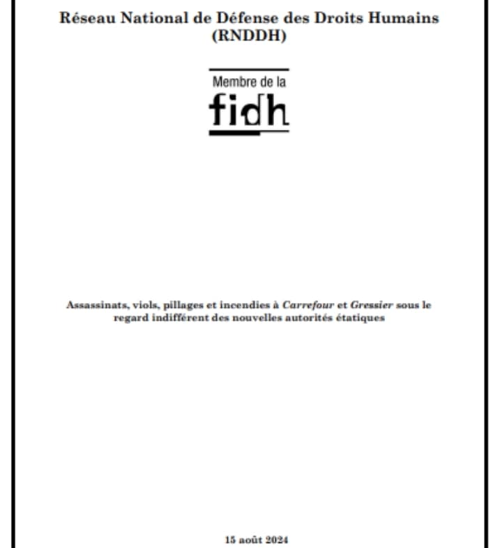 Dans un rapport en date du 16 août 2024, le Réseau national de défense des droits humains (RNDDH) appelle à une intervention rapide et décisive de l'État pour mettre fin à la violence incontrôlée qui ravage Carrefour et Gressier. Carrefour et Gressier sont plongées dans une terreur grandissante sous le contrôle des gangs armés. Les incendies, les meurtres et les viols se multiplient, tandis que les autorités peinent à reprendre le contrôle, laissa...